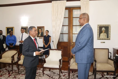 ސީޝެލްސްއަށް ކަނޑައެޅުއްވި ސަފީރު މަސްއޫދު އިމާދު، އެގައުމުގެ ރައީސަށް ފަތްކޮޅު އަރުވައިފި